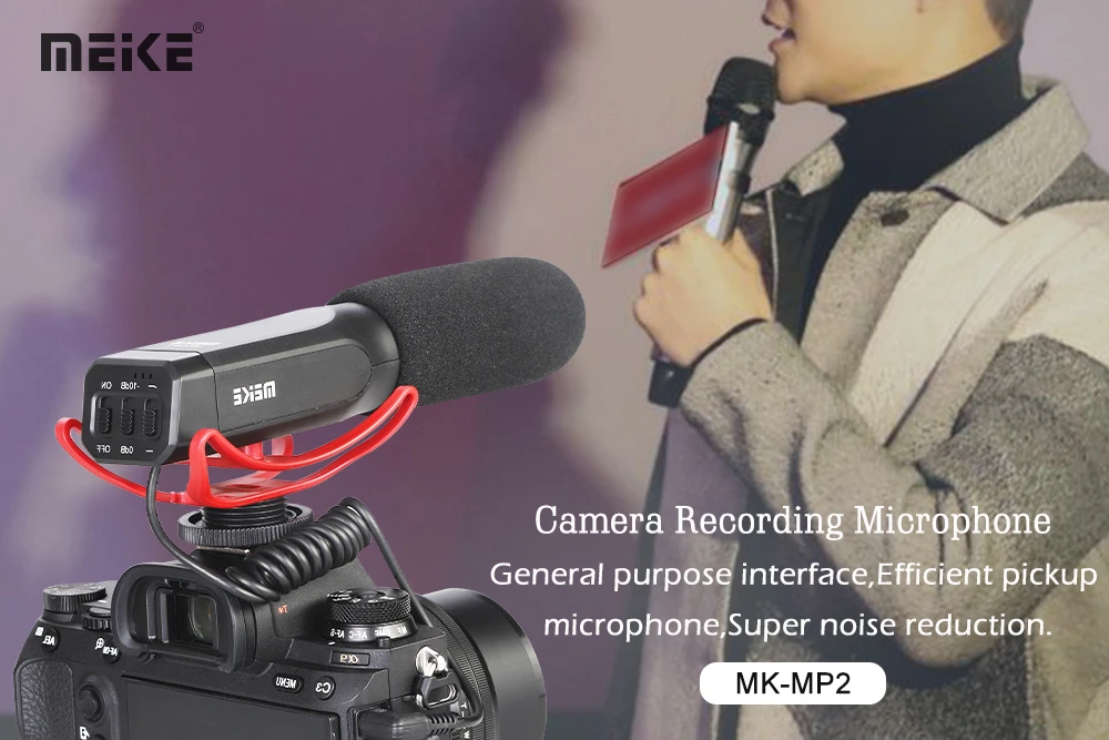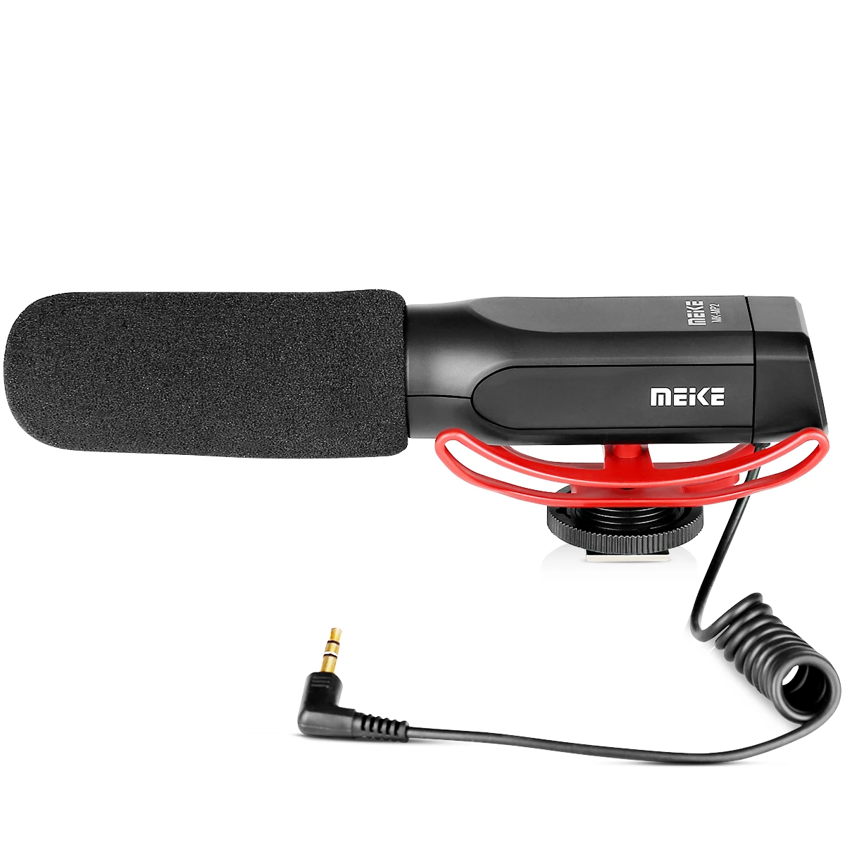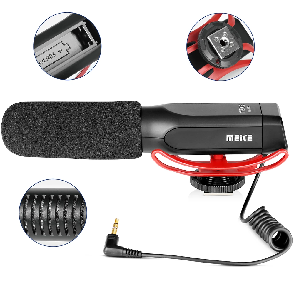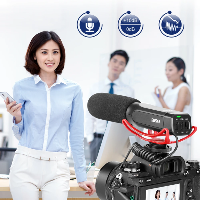 Micrófono electret compacto y direccional con soporte amortiguado integrado para la zapata del flash. Se alimenta con una pila AAA (autonomía de unas 50 horas), cuenta con una salida TRS estándar de 3,5 mm, y también incluye un conmutador de ganancia de +10 dB y un filtro de paso alto. Rango de frecuencia de 30 Hz a 20 kHz, ruido propio de 20 dB(A), presión acústica máxima admisible de 130 dB. El paquete incluye también una protección de espuma contra el viento.