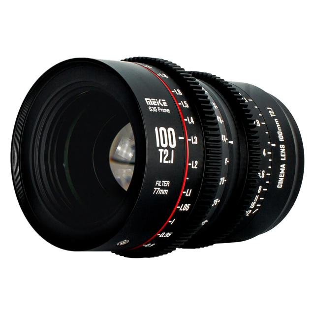 Objetivo cinematográfico Meike Prime 100 mm T2.1 para sistemas de cámaras de cine con formato Super 35, como RED Komodo, BMPCC 6K, BMPCC 6K Pro, Z CAM S6 y Canon C70, entre otros.