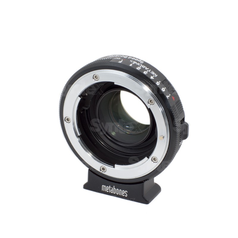 Adaptador para montar objetivos Nikon F/G en las cámaras Blackmagic Pocket Cinema Camera (HD), Micro Cinema Camera y Micro Studio Camera 4K. Además de adaptar la montura para los objetivos Nikon, reduce la distancia focal de los objetivos y disminuye el factor de recorte de la cámara de 2,88x a 1,75x, mientras que la luminosidad de los objetivos montados aumenta hasta f/0,74. Por ejemplo, el objetivo de 50 mm f/1,2 se transforma, mediante el adaptador, en uno de 29 mm f/0,74, mientras que el objetivo Sigma 18-35 mm f/1,8 se convierte en uno de 10,5-20,3 mm f/1,0.
