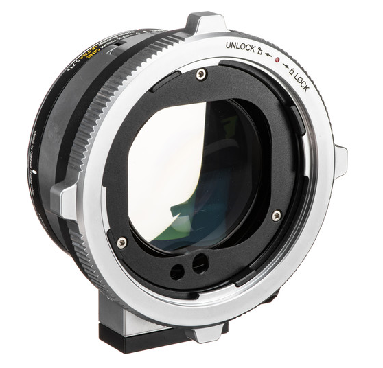 Este adaptador CINE Speed Booster Ultra 0,71x es totalmente mecánico y no proporciona comunicación electrónica entre el objetivo y la cámara. Los obturadores de láminas de los objetivos Hasselblad V no son compatibles, pero el funcionamiento del obturador en el plano focal es totalmente compatible.