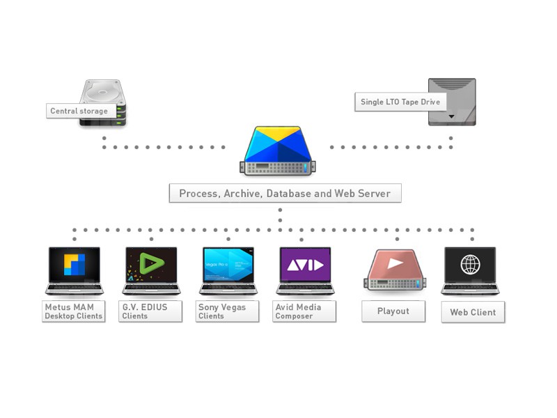 Sin embargo, dado que se ejecuta en un único servidor, es más adecuado para clientes pequeños y medianos. Tal y como se refleja en la estructura de licencias, la arquitectura del sistema limita la capacidad de escalado del archivo y no están disponibles algunas API y componentes opcionales de Metus MAM Enterprise, como la búsqueda basada en imágenes y la gestión del ciclo de vida de la información.