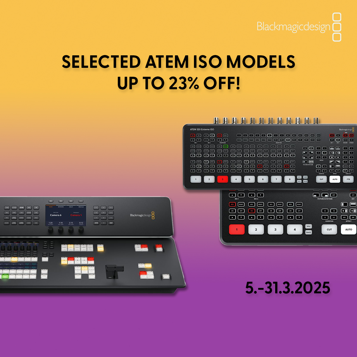 ¡Tenemos para ti una promoción única en productos seleccionados de la gama ATEM ISO de Blackmagic Design, que ahora puedes adquirir con un descuento de hasta el 15 %! El descuento es válido para los productos comprados entre el 5 y el 31 de marzo de 2025.