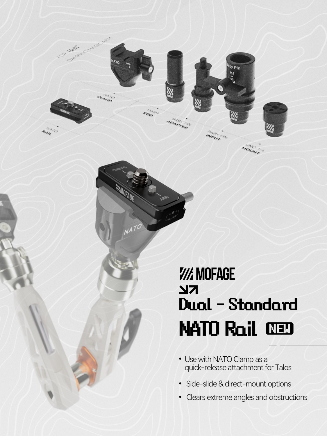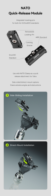 El riel NATO de doble estándar (Arri y SmallHD) está diseñado para que el montaje sea más versátil y cómodo. De este modo, se amplían las posibilidades de todo tu equipo.