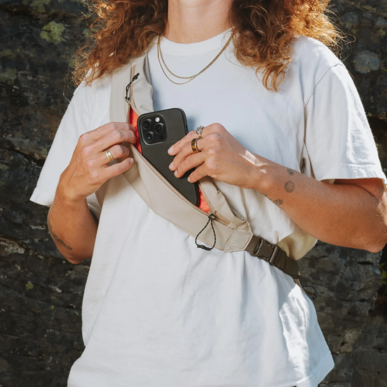 La correa incorpora un bolsillo tipo bandolera con un ligero acolchado y un clip independiente para que el teléfono, las llaves, los AirPods o los objetivos móviles estén siempre a mano.