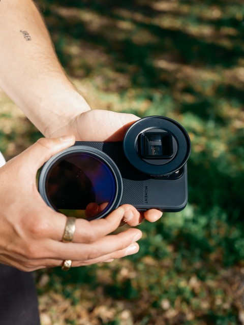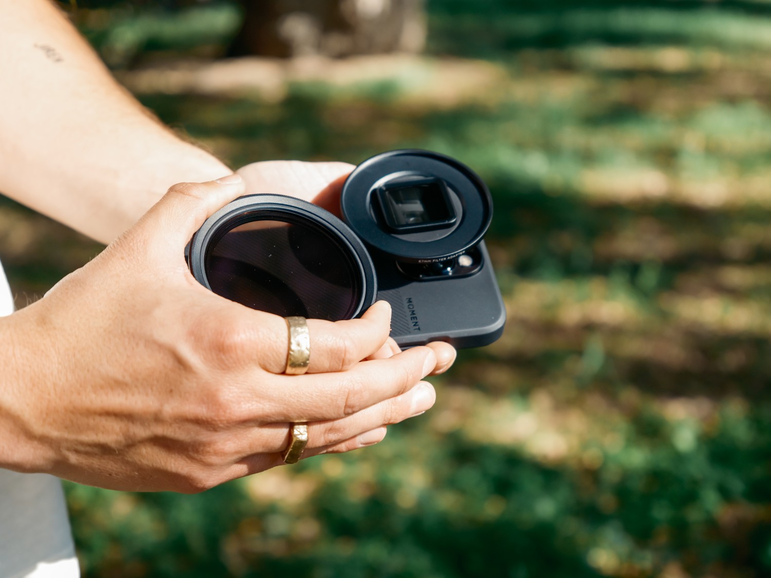 Los soportes de encaje permiten acoplar objetivos y filtros Moment al iPhone 15.