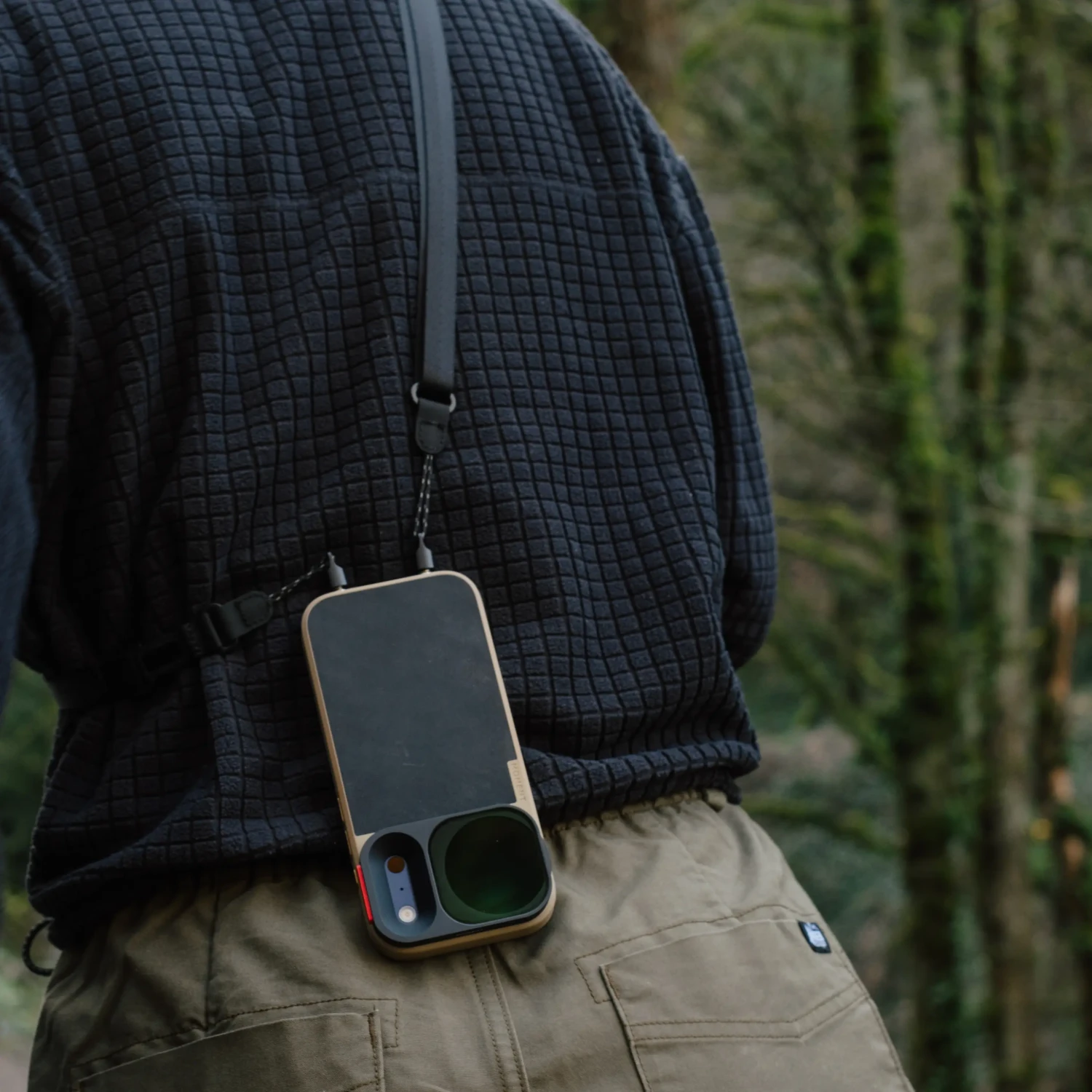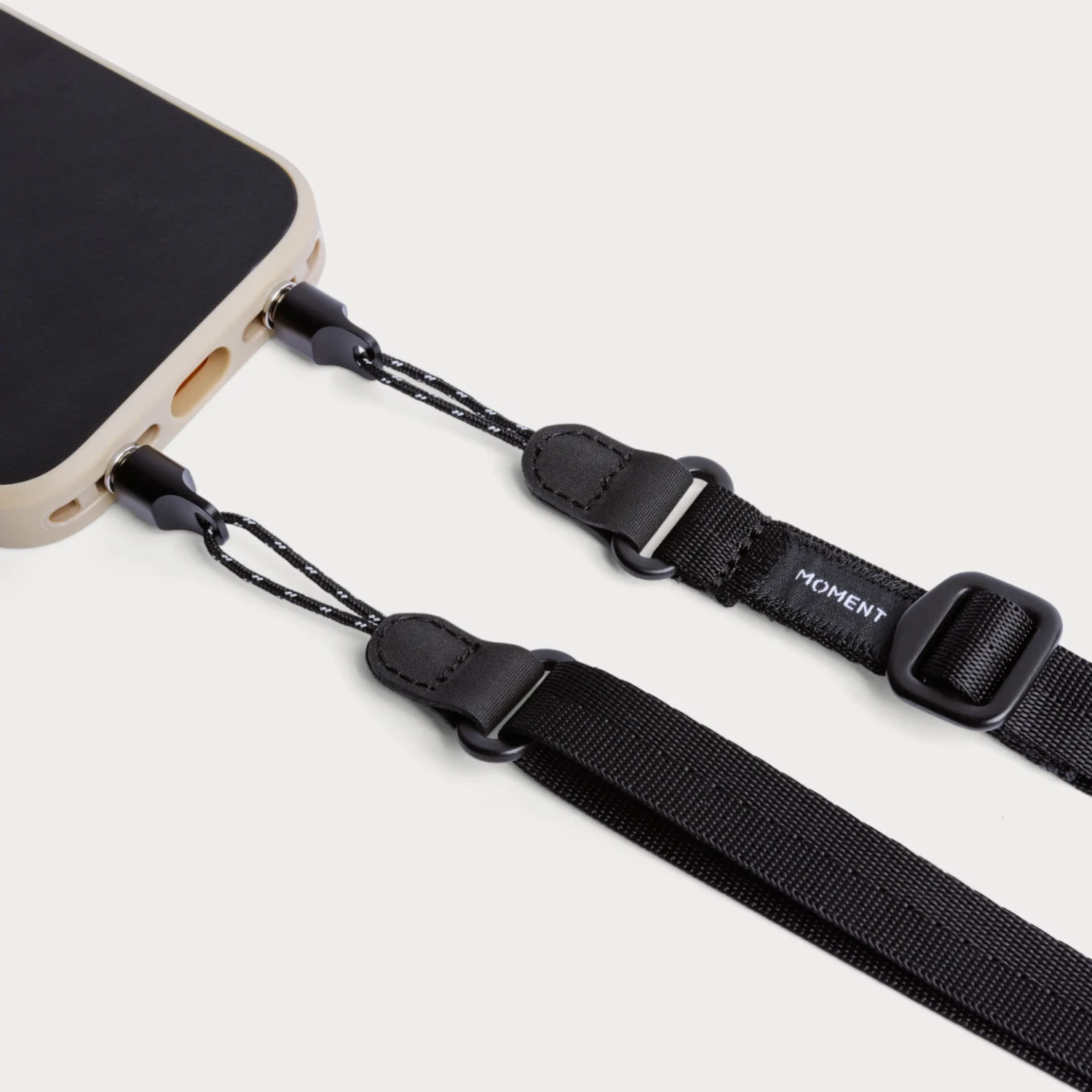 La correa se conecta directamente al punto de fijación integrado en cada funda Moment para iPhone 17 (excepto la versión Air), creando así una conexión directa con tu teléfono, no solo con la funda. Sin mosquetones de plástico ni puntos débiles, solo una sencilla correa de cordón que se pasa firmemente y se mantiene en su sitio sin importar lo activo que estés.