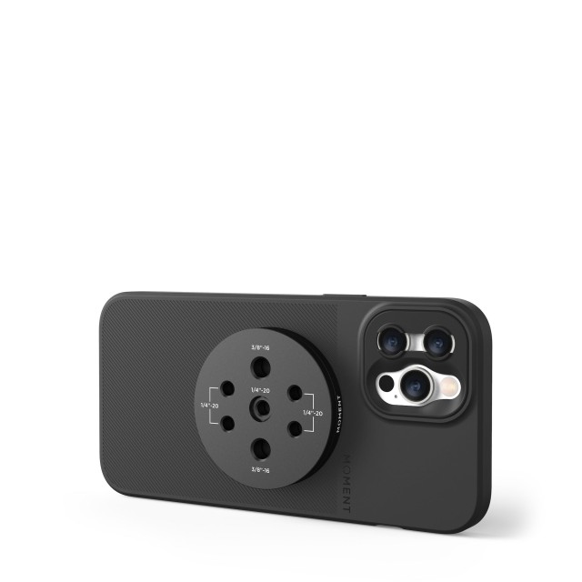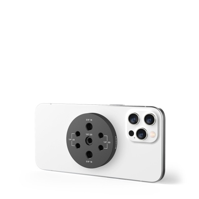 Presentamos un soporte con múltiples roscas para MagSafe®... es decir, una placa con cinco roscas internas en un lado e imanes extrafuertes en el otro... que fija de forma segura un iPhone con MagSafe a cualquier superficie. Este soporte, creado por los cineastas de Moment, es el primer soporte compatible con el sistema MagSafe que incluye (2) roscas internas de 3/8" y (3) roscas internas de 1/4"-20. Permite fijar el teléfono donde quieras utilizando cualquier accesorio de 1/4"-20 o 3/8". Brazos mágicos, trípodes, soportes para plataformas, rótulas, lo que se te ocurra... El soporte Moment con múltiples roscas te permite fijar el teléfono a él mediante imanes. Este soporte, que se puede utilizar con o sin funda, también incluye el sistema patentado de imanes (M)Force, que es aún más potente que los accesorios estándar, por lo que tienes una mayor seguridad de que el teléfono no se caerá.