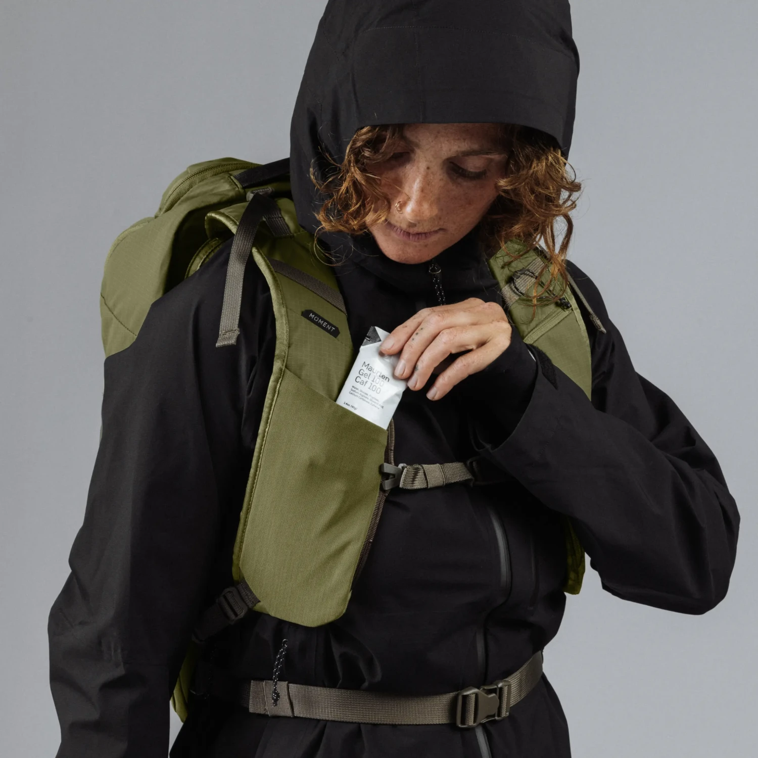 El material LightWeave™ Ripstop con doble capa de acabado DWR sin PFAS proporciona protección repelente al agua. La solapa magnética desvía el agua de la cremallera frontal, lo que reduce la entrada de agua en caso de lluvia torrencial.