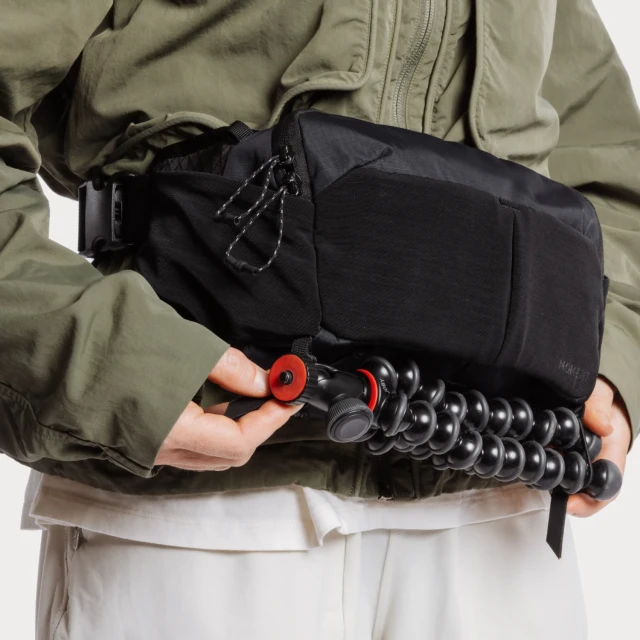 El compartimento principal tiene capacidad para una cámara sin espejo completa con un objetivo pequeño, y la parte acolchada incluye bolsillos para accesorios y objetos cotidianos. Gracias a sus materiales ultraligeros, su resistencia a la intemperie y sus herrajes de ajuste rápido, se adapta perfectamente a cualquier situación.