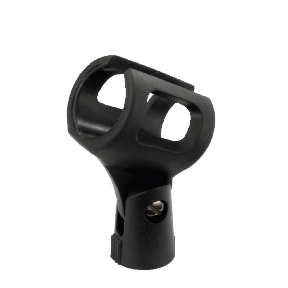 Soporte para micrófono fabricado en plástico rígido flexible de color negro, con un diámetro de entre 32 y 42 mm. Apto para micrófonos inalámbricos de mano con mango más grande, con una rosca estándar de 16 mm (⅝").