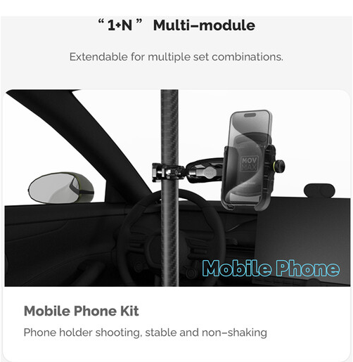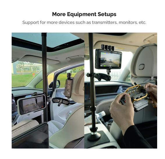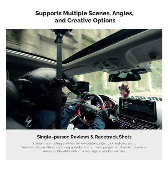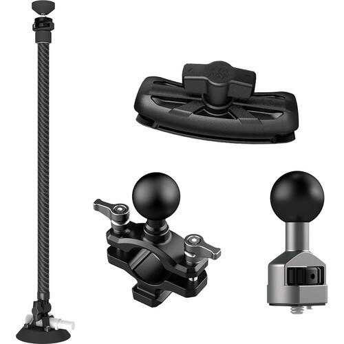 La barra telescópica ajustable MOVMAX con rosca de 1/4"-20 permite grabar con estabilidad desde el parabrisas del coche; se puede extender de 75 a 125 cm, está fabricada en fibra de carbono, cuenta con ventosas dobles para fijarla a la ventanilla del techo y a la consola central, y se suministra con una rótula de 1/4"-20, un brazo doble y una abrazadera con rótula para un ajuste totalmente articulado de la posición de la cámara.