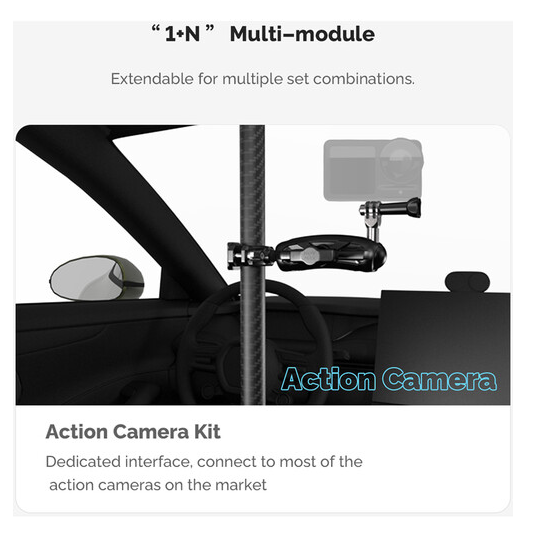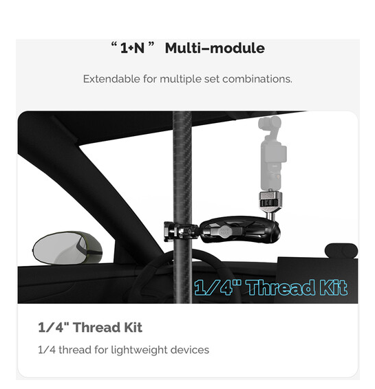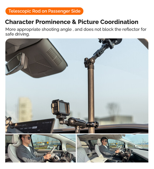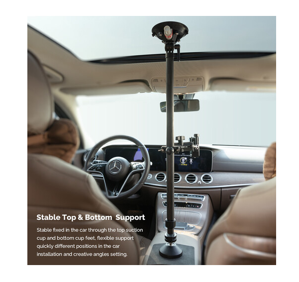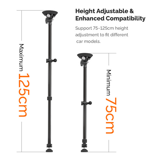 La barra telescópica ajustable MOVMAX con rosca de 1/4"-20 es un sistema de soporte ligero y de alta resistencia fabricado en fibra de carbono, diseñado para fijar de forma segura y sin vibraciones una cámara de vídeo en el interior de los vehículos, ideal para obtener tomas nítidas en primera persona a través del parabrisas. La barra se ajusta de forma continua de 75 a 125 cm mediante un seguro giratorio y es apta tanto para turismos compactos como para SUV. La ventosa superior se fija firmemente al cristal de la ventanilla del techo, mientras que la pata inferior se ancla a la consola central o al salpicadero, creando así una estructura triangular rígida que minimiza las sacudidas incluso en una conducción agresiva. Este kit incluye una rótula de 1" con rosca exterior de 1/4"-20 para la fijación directa de la cámara, un brazo de 3,9" con doble rótula para un giro completo de 360° y una inclinación de ±90°, y una abrazadera de varilla especial con rótula integrada para fijar monitores, luces o cámaras secundarias. El sistema es ideal para la cinematografía automovilística, los deportes de motor y los vlogs, y combina materiales de primera calidad, articulaciones de precisión y una sujeción por vacío fiable para ofrecer una estabilidad profesional en el coche.