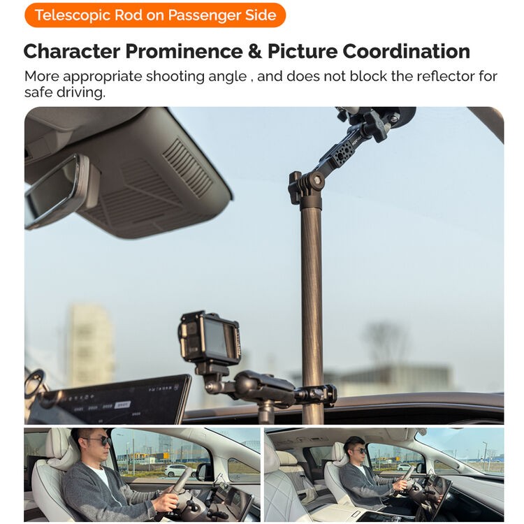 El soporte está fabricado en fibra de carbono de alta calidad, lo que garantiza resistencia y durabilidad con un peso mínimo. Es compatible con una amplia gama de accesorios para soportes, incluyendo rótulas, soportes para cámaras y otros componentes de filmación, lo que lo convierte en una herramienta flexible tanto para creadores de contenido como para cineastas. Ya sea que grabes vlogs de viajes, secuencias de acción o tomas cinematográficas desde el interior de un vehículo, esta barra telescópica ofrece una solución de sujeción fiable que es fácil de instalar y ajustar.