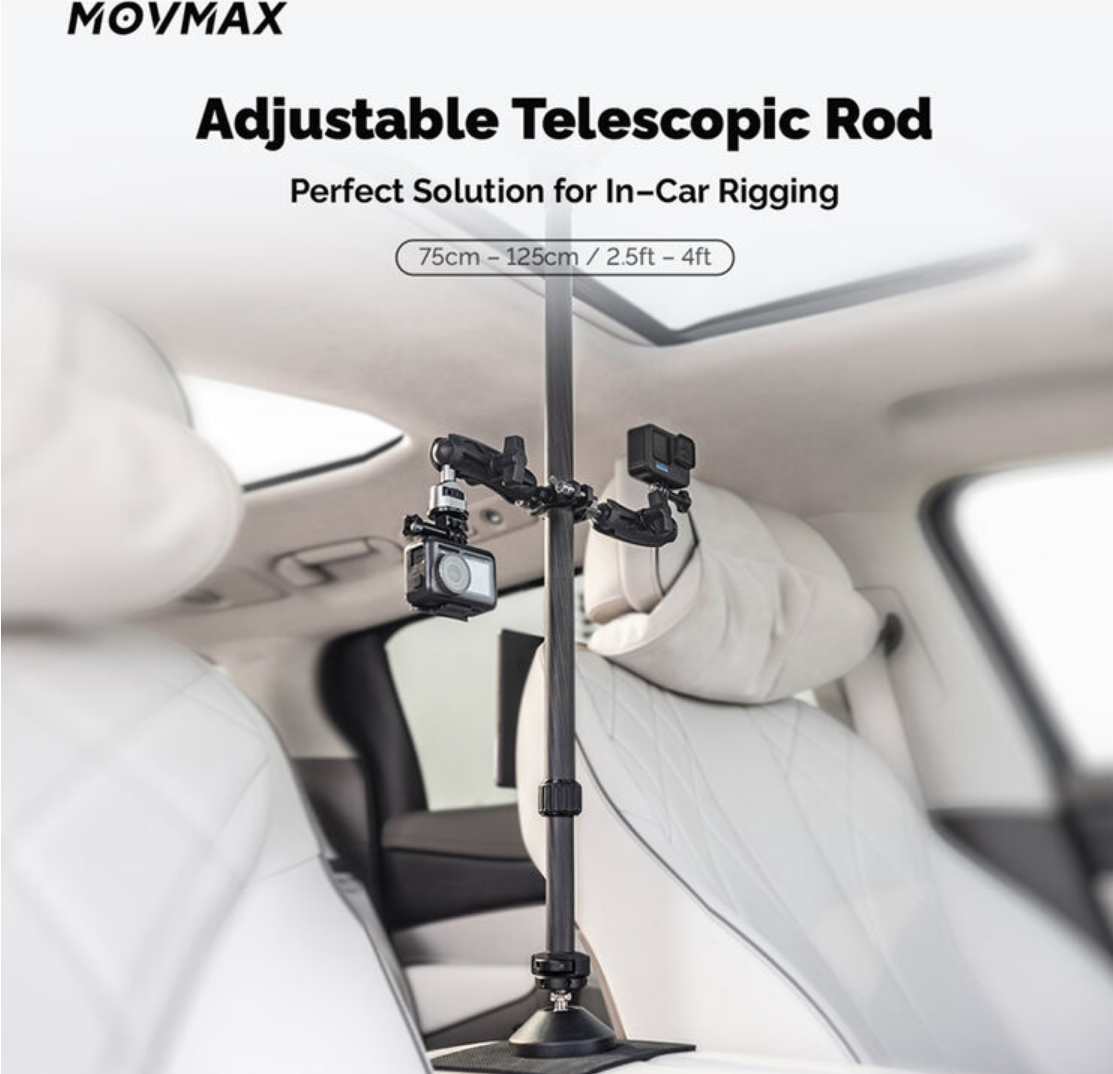 Captura imágenes dinámicas desde el interior del vehículo con la barra telescópica ajustable MOVMAX, que cuenta con una altura de trabajo de entre 2,5 y 4 pies, un soporte robusto con ventosa y una estructura de fibra de carbono. Esta barra ligera pero resistente, diseñada para un ajuste versátil de la perspectiva del primer plano (POV) en el interior de su coche, proporciona un soporte estable para cámaras y accesorios.