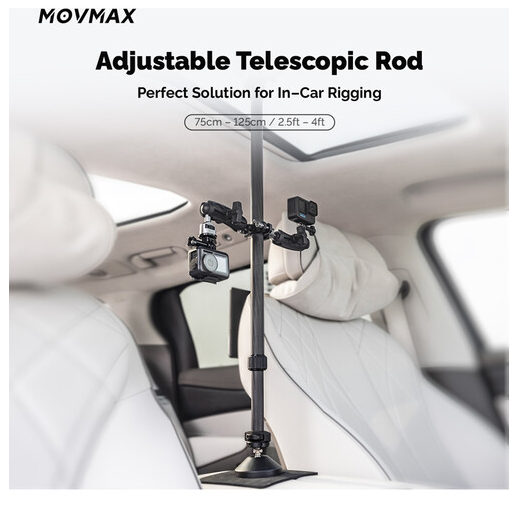La barra telescópica ajustable MOVMAX con soporte de tres puntos permite grabar con seguridad con una cámara de acción en el coche a través del parabrisas. Su longitud se puede ajustar entre 2,5 y 4 pies y cuenta con dos ventosas para el techo solar y la consola central. El paquete también incluye un adaptador de tres puntos con rótula, un brazo doble y una abrazadera con rótula para una colocación versátil.