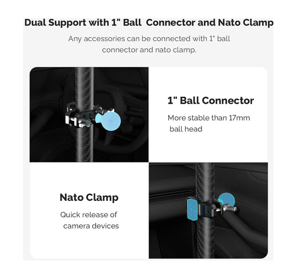 El palo telescópico ajustable MOVMAX con soporte para smartphone es una solución profesional para capturar imágenes fluidas y de alta calidad en primera persona a través del parabrisas del vehículo utilizando smartphones o dispositivos móviles compactos. La barra está fabricada en fibra de carbono de primera calidad y, gracias a un seguro sistema de bloqueo giratorio, se extiende de forma continua de 75 a 125 cm, adaptándose así a diferentes interiores de vehículos, desde sedanes hasta SUV. La ventosa superior se fija de forma segura al cristal de la ventanilla del techo, mientras que la pata inferior se fija a la consola central o al salpicadero, creando un marco rígido y resistente a las vibraciones, ideal para conducir a alta velocidad o por terrenos irregulares. Este kit incluye una abrazadera con resorte para smartphone con rótula de 1" integrada (apta para dispositivos de 2,2 a 3,5" de ancho), un brazo de 3,9" con rótula doble para un giro de 360° y control total de la inclinación, y una abrazadera de varilla con rótula para fijar accesorios secundarios, como luces o micrófonos. El sistema es ideal para vlogueros, críticos de automóviles y cineastas móviles, y garantiza un encuadre preciso, vibraciones mínimas y máxima flexibilidad creativa en condiciones dinámicas de grabación en el coche.