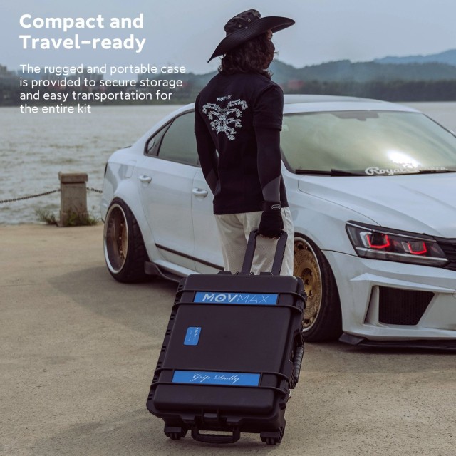 El kit MOVMAX Grip Dolly Pro es un carro resistente con una capacidad de carga de 198 libras. Incluye una placa plana, adaptadores esféricos de 75/100/150 mm, un adaptador Mitchell y ruedas de polímero para un desplazamiento estable. El carro está equipado con varias roscas de 1/4"-20 y 3/8"-16, soportes centrales y laterales, y se suministra con una maleta de transporte para facilitar su traslado y almacenamiento.