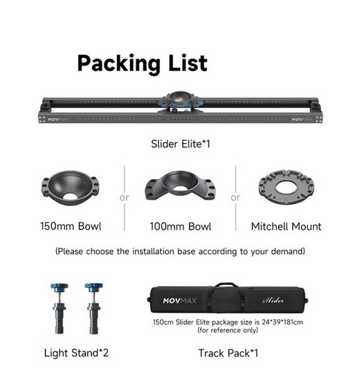 El MOVMAX Camera Slider Elite 59" es un slider profesional y resistente de aluminio con una longitud de 59 pulgadas, que se caracteriza por un movimiento fluido basado en la fricción y un carro con fijación Mitchell capaz de soportar hasta 25 kg (55 lb). Está diseñado para movimientos de cámara cinematográficos e incluye controles de freno y amortiguador, dos adaptadores de 5/8" para trípode de iluminación que permiten ajustes más elevados, y se suministra con una maleta de transporte para facilitar su traslado.