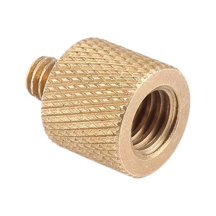 Adaptador de cobre chapado en oro con rosca de 3/8" a 1/4", ideal para fijar cámaras fotográficas, videocámaras, grabadoras de bolsillo o soportes adicionales a trípodes de micrófono y de estudio.