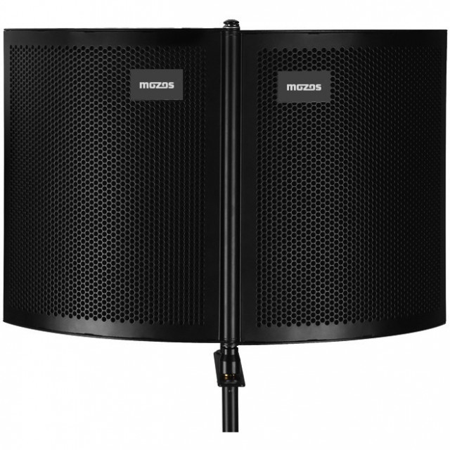 Moses Mshield: un biombo acústico que garantiza una señal limpia y sin ruido. Ideal para grabar voces, podcasts, locuciones, etc. La pared interior está fabricada con espuma acústica de alta calidad que absorbe el ruido, mientras que la pared exterior está recubierta por una estructura de aluminio que garantiza un transporte y almacenamiento seguros. El biombo se puede montar en un soporte de micrófono.