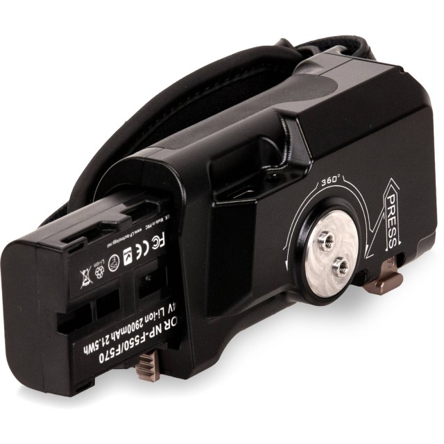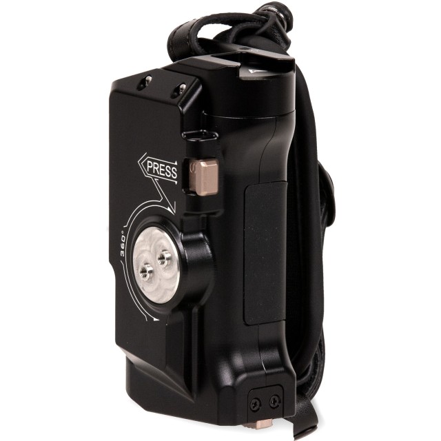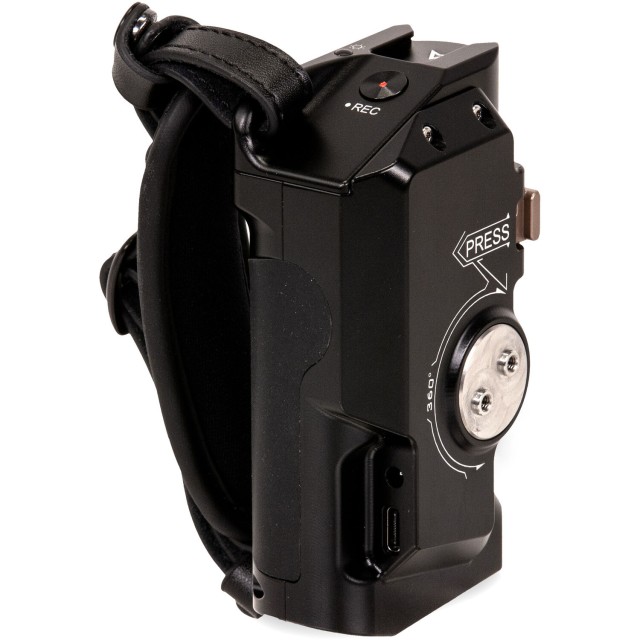 La empuñadura de alimentación avanzada Tilta Left-Side, en color negro, se fija al lado izquierdo de las jaulas para cámaras Tiltaing mediante un soporte opcional para riel/roseta: el adaptador Tilta Left-Side de tipo IV, V o VI. La empuñadura está diseñada para la batería Sony F570 (se vende por separado) y cuenta con dos salidas de alimentación para alimentar accesorios desde la batería. Ofrece un puerto de salida USB tipo C de 8 V y un puerto de corriente continua de 12 V. Además, esta empuñadura de alimentación avanzada cuenta con un botón de inicio/parada para controlar el inicio y la parada de la grabación en cámaras compatibles mediante la conexión opcional de un cable R/S.