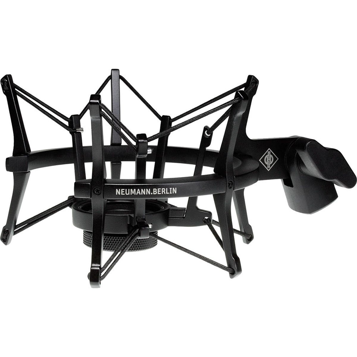 Soporte de micrófono con suspensión y articulación, apto para los micrófonos Neumann M 147 Tube, TLM 102, TLM 103, TLM 107, (TLM 127), TLM 193 y Sennheiser MK 4. El soporte está equipado con una rosca de 5/8"-27 con un adaptador para trípodes con tornillos de 1/2" y 3/8".