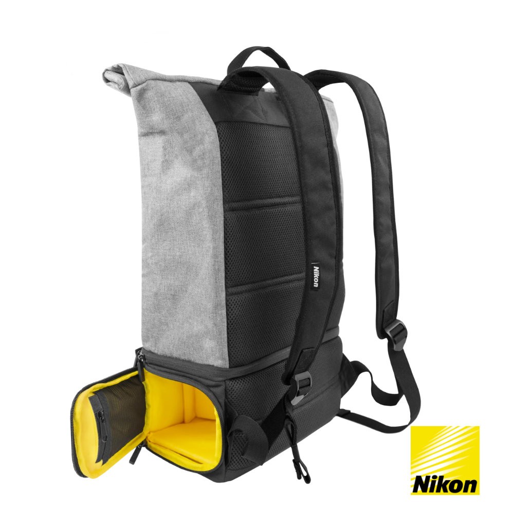 Una mochila de diseño sofisticado con funda compatible con las cámaras Nikon Z. El compartimento inferior, con forro suave, ofrece espacio para la cámara, los objetivos y los accesorios, y cuenta con una abertura lateral de acceso rápido, ideal para guardar un segundo objetivo.