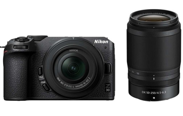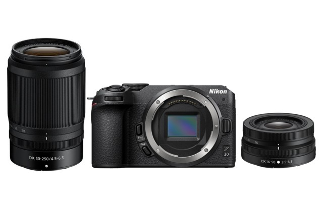 Este kit, que incluye dos objetivos zoom, cubre todos los ángulos de visión necesarios. El kit contiene la cámara sin espejo Z 30 y dos objetivos zoom retráctiles. El objetivo NIKKOR Z DX 16–50 mm f/3,5–6,3 VR permite capturar desde tomas gran angulares hasta retratos sin necesidad de cambiar de objetivo. El objetivo NIKKOR Z DX 50–250 mm f/4,5–6,3 VR ofrece distancias focales que van desde el teleobjetivo corto hasta el largo. Ambos objetivos enfocan de forma casi silenciosa, lo que los convierte en el equipo ideal para la grabación de vídeo.