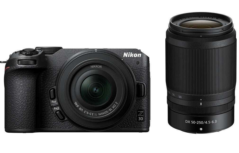 Este kit, que incluye dos objetivos zoom, cubre todos los ángulos de visión necesarios. El kit contiene la cámara sin espejo Z 30 y dos objetivos zoom retráctiles. El objetivo NIKKOR Z DX 16–50 mm f/3,5–6,3 VR permite capturar desde tomas gran angulares hasta retratos sin necesidad de cambiar…