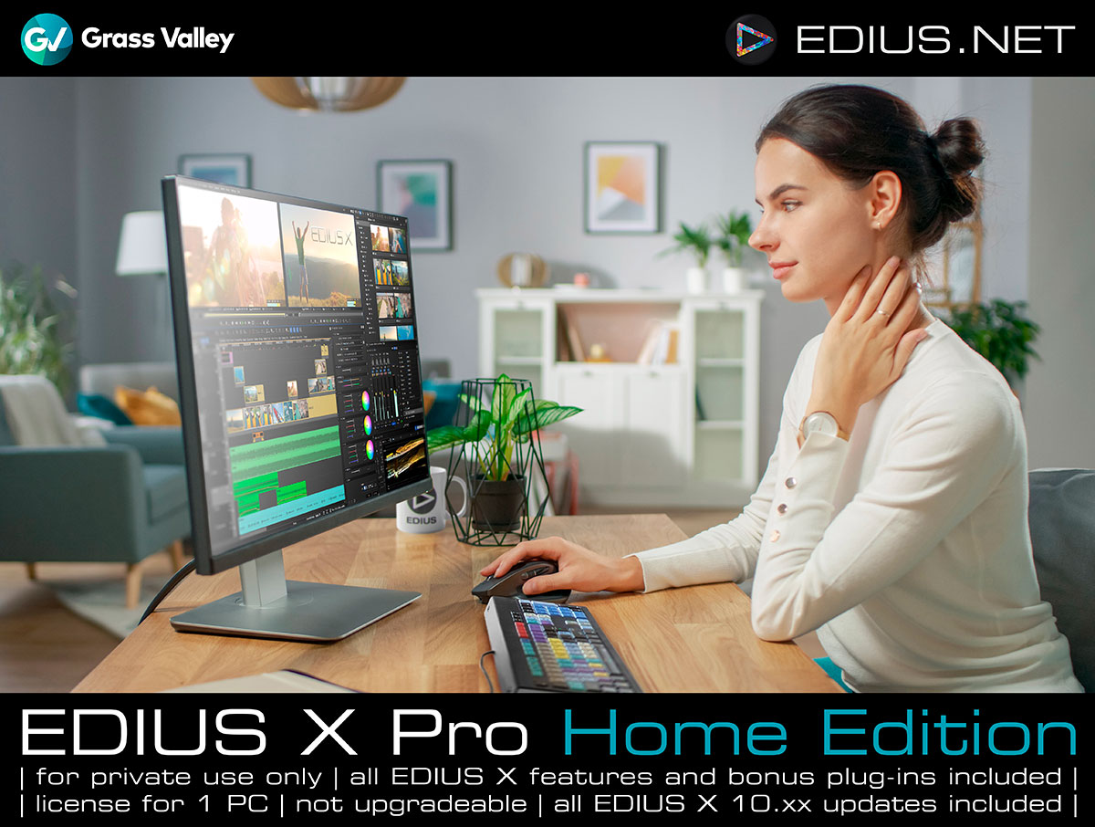EDIUS X Pro Home Edition ¡Ya está aquí! La versión económica de Grass Valley EDIUS X Pro Home Edition ofrece las mismas funciones que la versión completa de la aplicación de edición EDIUS X Pro, incluidos los complementos adicionales de las marcas Acon, ProDAD y NewBlue—, pero solo se puede utilizar para fines privados, solo se puede activar en un ordenador (la versión estándar permite dos activaciones) y, en el futuro, solo se podrá actualizar a la nueva versión 11 a través de la oferta Jump Upgrade.