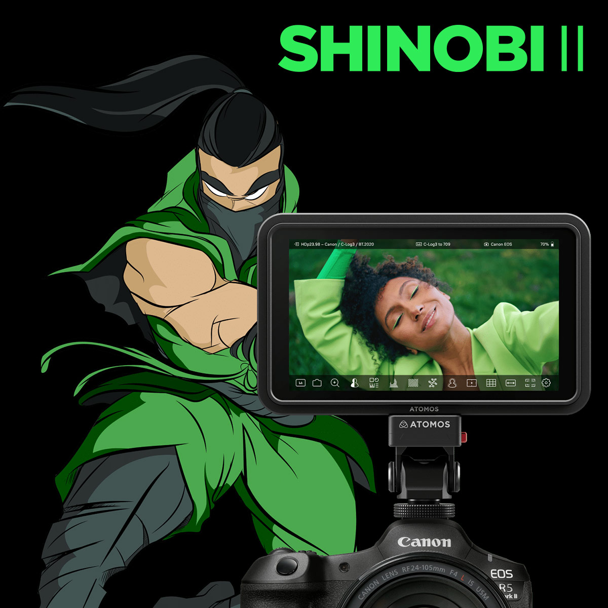 La empresa Atomos se hizo famosa por sus grabadoras Ninja y Shogun con Apple ProRes HDR , pero en 2019 también lanzó Shinobi, una solución dedicada exclusivamente a la monitorización que también tuvo un éxito extraordinario: ¡se vendieron más de 100 000 unidades en todo el mundo! La segunda generación, Shinobi II, es un monitor HDR de 5 pulgadas, delgado y ligero, con un alto brillo de 1.500cd/m² y la posibilidad de controlar (incluido el inicio de la grabación) la mayoría de las cámaras sin espejo de Canon, Panasonic o Sony (a través de USB-C) y la Z CAM E2 (requiere un cable LANC opcional). Con futuras actualizaciones, Atomos tiene previsto admitir también modelos de las marcas Fujifilm, Nikon, OM System y Sigma. La intuitiva pantalla táctil también se ha mejorado; con un alto brillo de 1.500cd/m², tiene un 50 % más de luminosidad que su predecesor y admite la visualización de vídeo HDR de 10 bits con latencia cero.