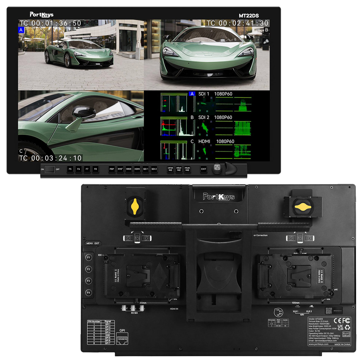 El tan esperado monitor de 21,5 pulgadas Portkeys MT22DS ¡por fin está disponible! El nuevo monitor de producción ofrece la posibilidad de alimentarse mediante baterías V-Mount o NP-F, interfaces HDMI y 3G-SDI, dos entradas de audio con conectores XLR y alimentación de 48 V, así como un panel calibrado (Rec.709) con una resolución de 1920x1080 y un brillo de 1000cd/m². Por supuesto, incluye una serie de funciones de medición y monitorización, salida de auriculares, conversión HDMI/SDI, visualización multiview o corrección 3D LUT (también en las salidas SDI y HDMI).