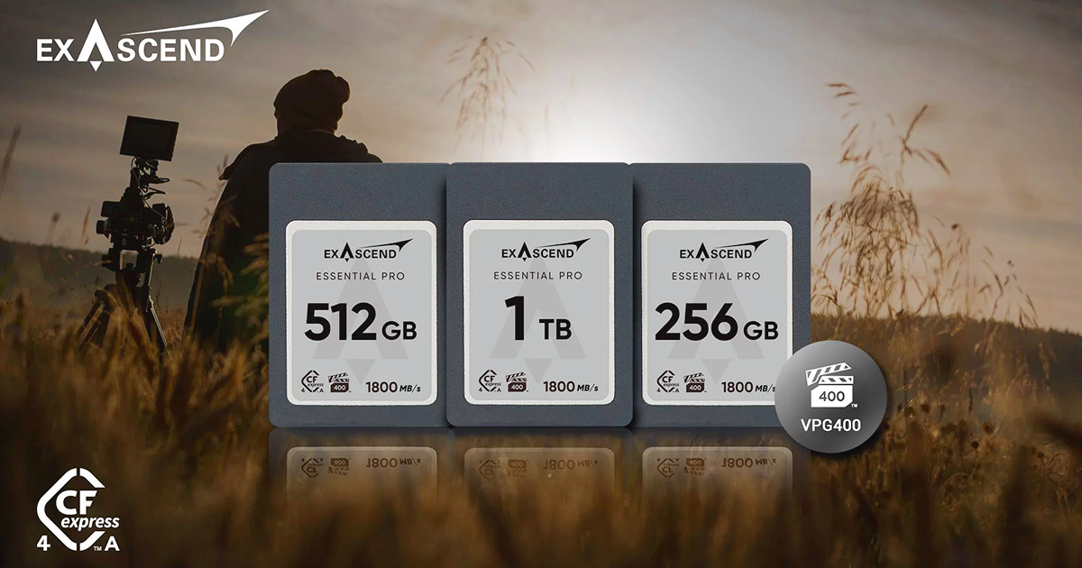 Exascend presenta nuevas tarjetas de memoria CFexpress 4.0 Tipo A. Los nuevos modelos «Essential Pro» son compatibles con el estándar CFexpress 4.0 presentado en agosto de 2023 —que permite velocidades teóricas de hasta 4 GB/s (Tipo B) y 2 GB/s (Tipo A)— y estarán disponibles en capacidades de 256 GB, 512 GB y 1 TB, con velocidades de lectura/escritura de hasta 1800/1650 MB/s. Las tarjetas integran la interfaz PCIe Gen4 x1 y corrección LDPC ECC, cuentan con la certificación VPG400 («Video Performance Guarantee Profile 4»), que garantiza una grabación fiable de vídeo de hasta 8K/120 fps, y están protegidas por una garantía de 10 años; la compatibilidad con las cámaras Sony (A1, A7S III, A7 IV, FX3, FX6...) es un hecho. A la venta a partir de finales de marzo.