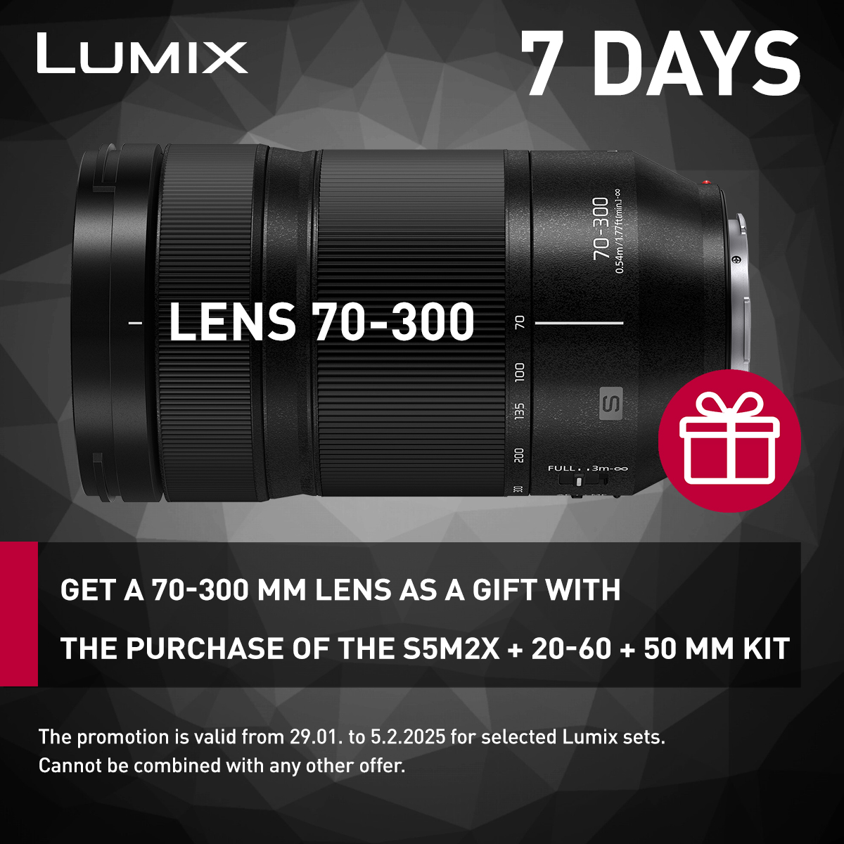 Desde el 29 de enero hasta el 12 de febrero de 2025, puedes aprovechar una oferta exclusiva: al comprar el kit Panasonic Lumix S5M2X + 20-60 mm + 50 mm, ¡recibirás un tercer objetivo gratis! Se trata del teleobjetivo S 70-300 mm F4.5-5.6 Macro O.I.S.