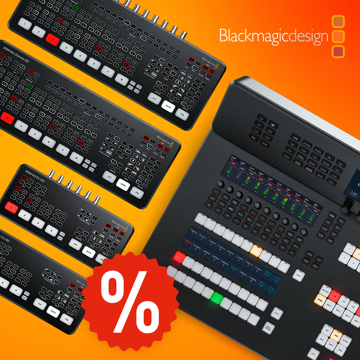 Todas las versiones «ISO» (es decir, con grabación de todas las entradas) de las mesas de mezcla Blackmagic Design ATEM se ofrecentemporalmente (o hasta agotar existencias del fabricante) a precios de oferta. Además de todas las entradas, las versiones ISO también pueden guardar proyectos de DaVinci Resolve para facilitar al máximo la posproducción; la conversión de estándares en las entradas, el croma (ATEM Advanced Chroma Keyer) y los reproductores multimedia son características estándar. ¡El modelo superior, el ATEM Television Studio HD8 ISO, se ofrece además temporalmente con 2 TB de almacenamiento interno incluido en el precio!