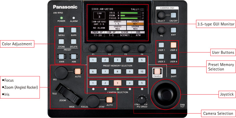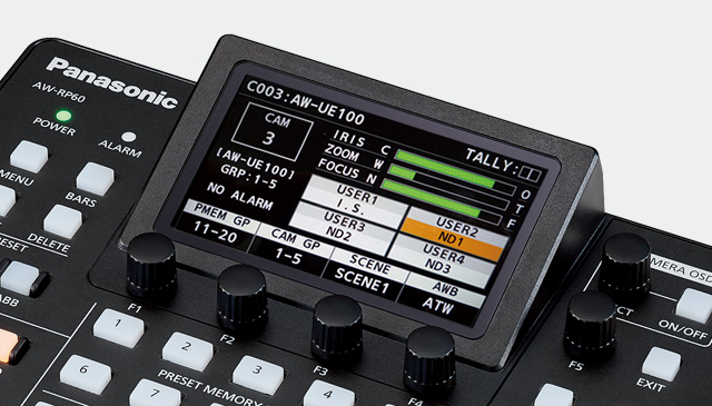 La cámara AW-RP60GJ está equipada con una pantalla LCD de 3,5 pulgadas que ofrece una interfaz gráfica de usuario (GUI) en la que se muestra la información necesaria de un solo vistazo, lo que permite un manejo intuitivo y rápido de la cámara.