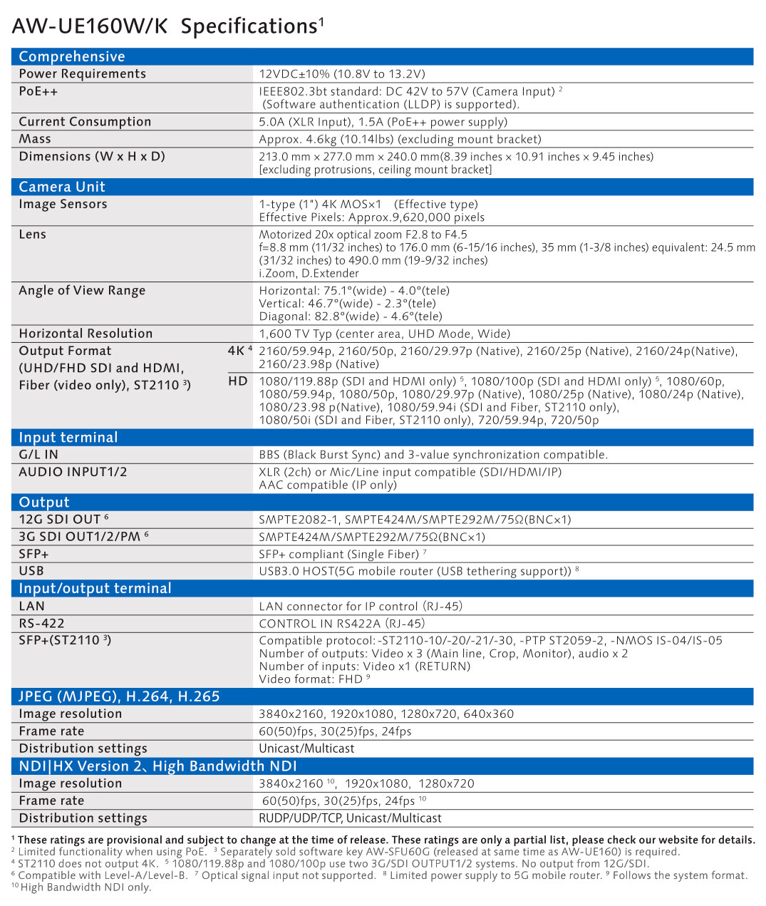 ¡La Panasonic AW-UE160W/K es una cámara de instalación 4K de nueva generación diseñada para la retransmisión de programas en directo con la máxima calidad! El nuevo buque insignia de la flota PTZ de Panasonic ofrece la flexibilidad de las cámaras de instalación controladas a distancia, así como la calidad de imagen y las funciones de los modelos de estudio y cinematográficos. El software opcional AW-SFU60 la convierte además en la primera cámara PTZ del mercado compatible con el estándar IP SMPTE ST2110. A la venta a partir del primer trimestre de 2023.