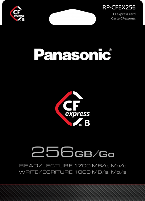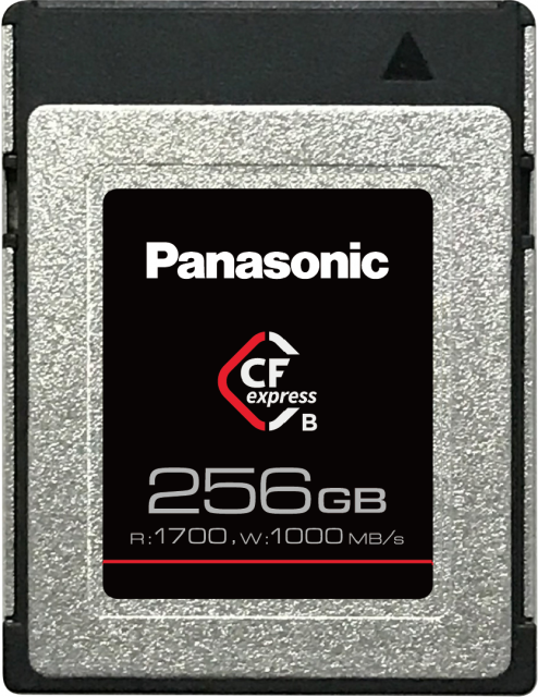 Tarjeta CFexpress profesional de 256 GB de Panasonic con altas velocidades de lectura y escritura, diseñada para un uso intensivo a largo plazo y una grabación segura.