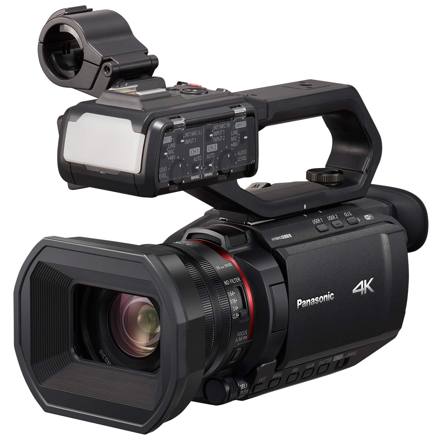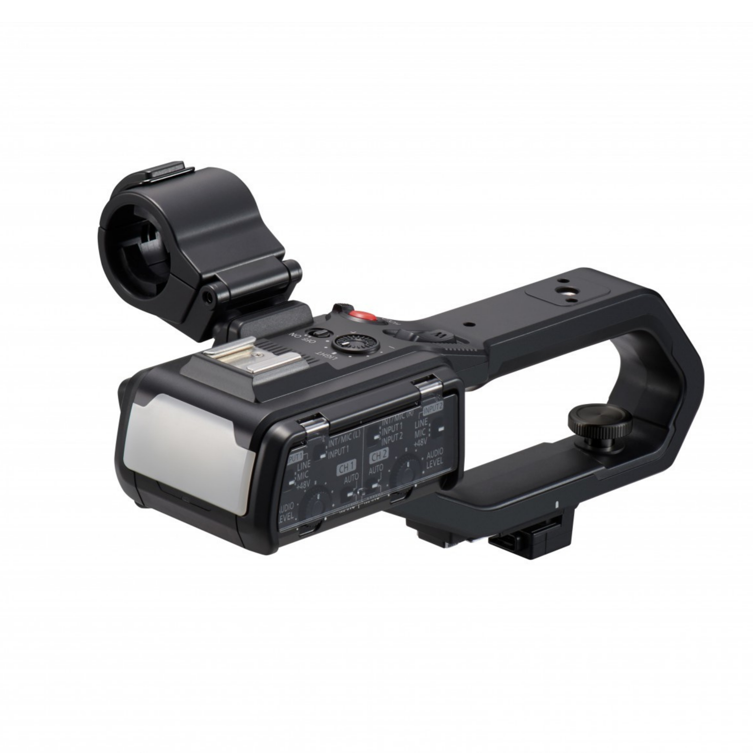 El dispositivo VW-HU1 se fija a la parte superior de la cámara mediante un conector patentado y se asegura con un tornillo de mariposa. Las dos entradas de audio XLR de tres pines cuentan con control de volumen y funciones seleccionables de micrófono/línea y alimentación fantasma de +48 V, lo que permite añadir dos canales de audio a la grabación. El soporte para micrófono de la parte superior admite cómodamente un micrófono tipo shotgun estándar.