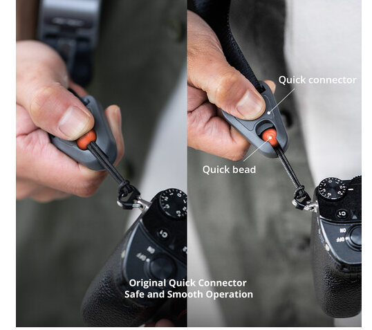 Cada correa está equipada con un conector de cierre rápido y un sistema de bloqueo magnético que las mantiene fijas cuando no se utilizan. La hebilla del conector está fabricada con tres capas de UHMWPE, incluyendo una capa exterior resistente, una capa interior con aviso de necesidad de sustitución y un núcleo de soporte que soporta de forma segura hasta 198 lb. Los ajustadores rápidos de longitud te permiten ajustar la correa en cuestión de segundos con una sola mano, para que puedas llevar fácilmente la cámara a la altura ideal.