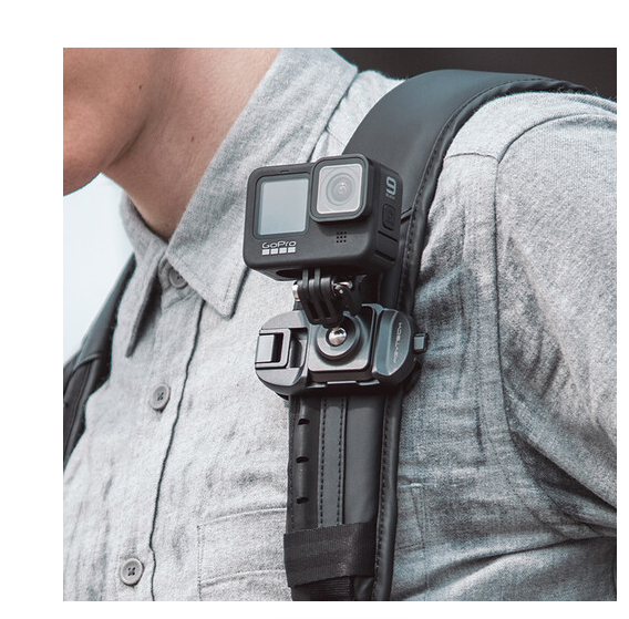 Fija la cámara de forma segura a la correa de la mochila o al cinturón