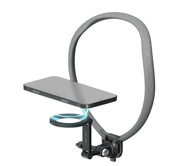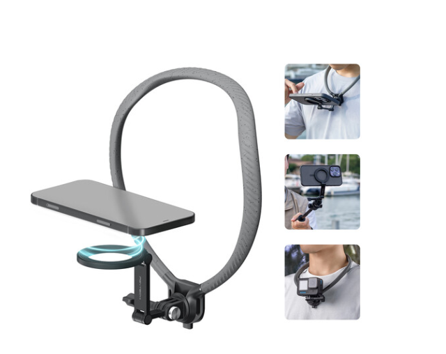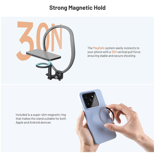 El soporte está equipado con el sistema magnético de fijación rápida CapLock, que sujeta de forma segura los smartphones con MagSafe o anillos de fijación magnéticos y permite montarlos o desmontarlos rápidamente. El brazo articulado se fija firmemente en la posición deseada para un encuadre preciso. Para una mayor versatilidad, el paquete incluye un soporte para cámaras de acción, lo que lo hace compatible con cámaras compactas como los modelos GoPro y DJI.