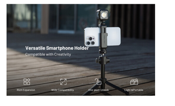 El soporte universal para smartphone es apto para teléfonos de 2,4 a 3,6 pulgadas de ancho, cuenta con juntas de silicona que protegen tu dispositivo e incluye un soporte para accesorios. Su sistema de desbloqueo con un solo toque y su rosca interna de 1/4"-20 permiten un ajuste rápido y la compatibilidad con trípodes. Gracias a su construcción de alta calidad en aluminio, acero y plásticos resistentes, esta combinación garantiza comodidad y fiabilidad al grabar durante tus viajes.