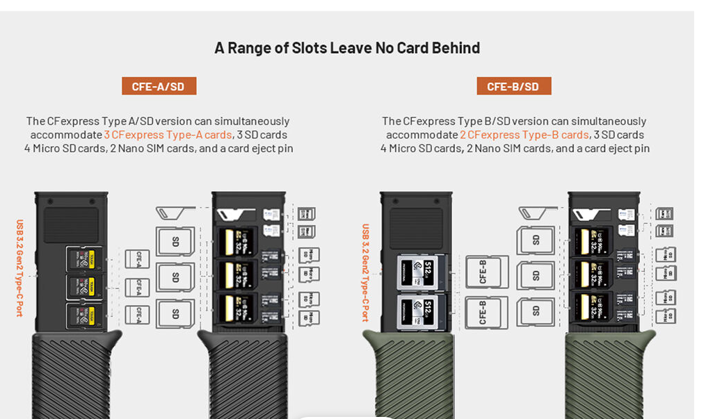 Almacena hasta 12 tarjetas: 3 CFexpress tipo A, 3 SD, 4 microSD, 2 Nano SIM