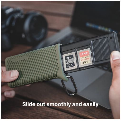 La funda PGYTECH CreateMate CFexpress Type B / SD Card Reader Case combina un almacenamiento resistente y una transferencia de datos ultrarrápida en un único dispositivo compacto. La funda está fabricada en aleación de aluminio con una cubierta protectora de silicona y puede albergar de forma segura dos tarjetas CFexpress Type B, tres tarjetas SD, cuatro tarjetas microSD y dos tarjetas Nano SIM, mientras que el cable USB-C 3.2 Gen 2 integrado permite una velocidad de transferencia de datos de hasta 1000 MB/s para tarjetas CFexpress y de 312 MB/s para tarjetas UHS-II SD/microSD.