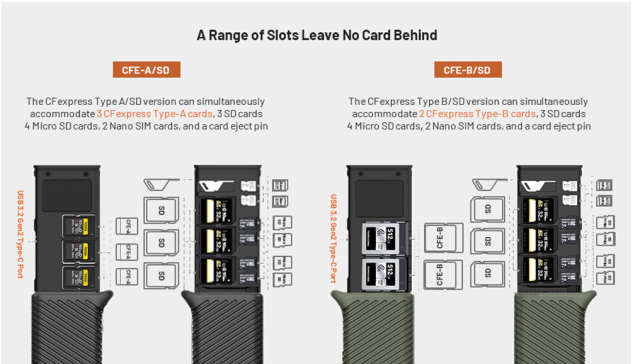 Combinación de almacenamiento de tarjetas y lector: Almacena 11 tarjetas, incluidas 2 tarjetas CFexpress tipo B, 3 tarjetas SD, 4 tarjetas microSD y 2 tarjetas Nano SIM.
