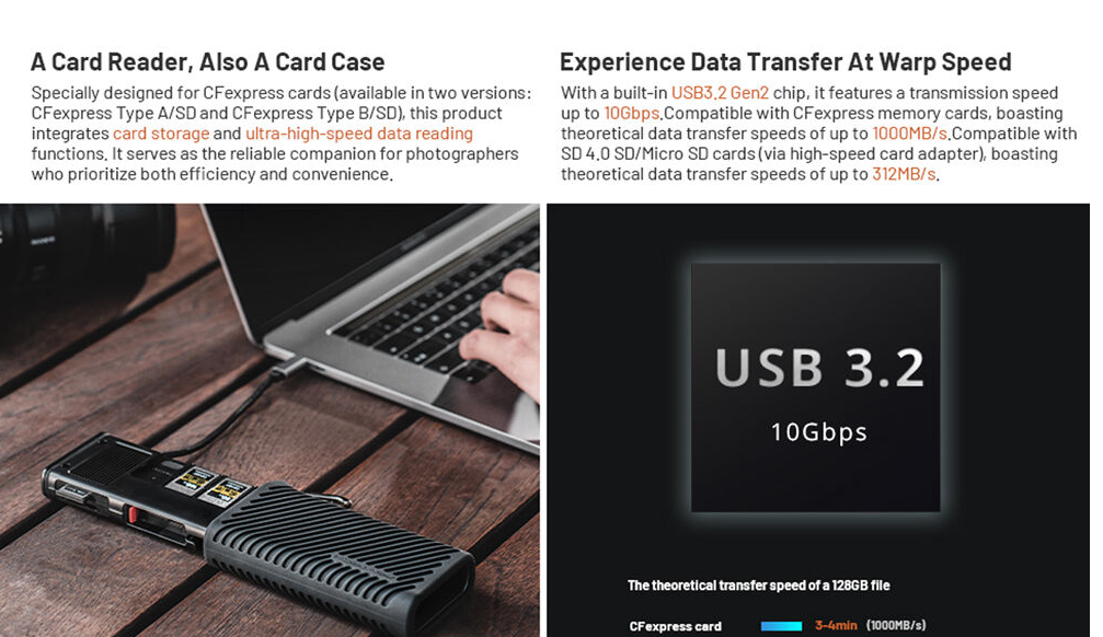 Compatibilidad universal: tarjetas CFexpress tipo B, UHS-I/II SD/SDHC/SDXC; funciona con cámaras, drones, smartphones y cámaras de acción