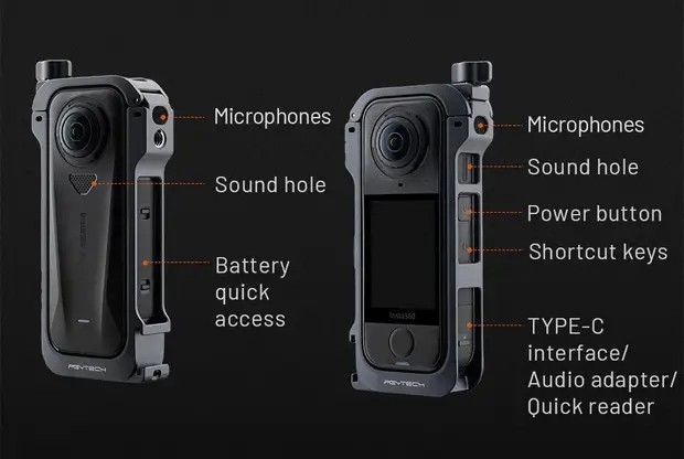 A pesar del marco rígido, todos los controles, puertos y la rosca de fijación rápida inferior de 1/4"-20 siguen siendo totalmente accesibles y compatibles con el sistema original de Insta360. La carcasa está diseñada para no afectar a la calidad de la señal, la transmisión de datos ni el uso de un micrófono externo.