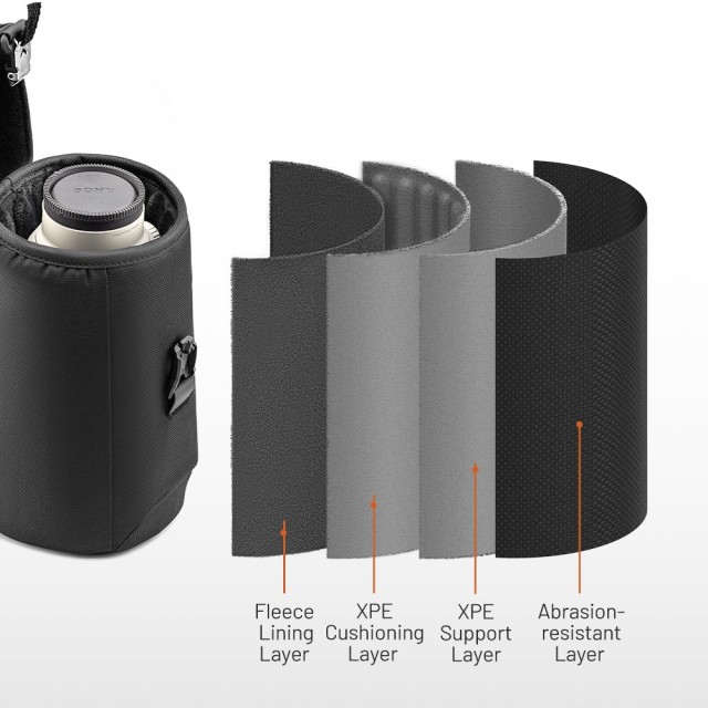 La parteexterior está fabricada con un tejido resistente que repele las salpicaduras de agua y el polvo. La cremallera especial, con mayor resistencia a la intemperie, impide la entrada de humedad. En el interior hayun revestimiento de espuma viscoelástica que se adapta a la forma del objetivo, amortigua los golpes y evita los arañazos incluso con un uso frecuente.