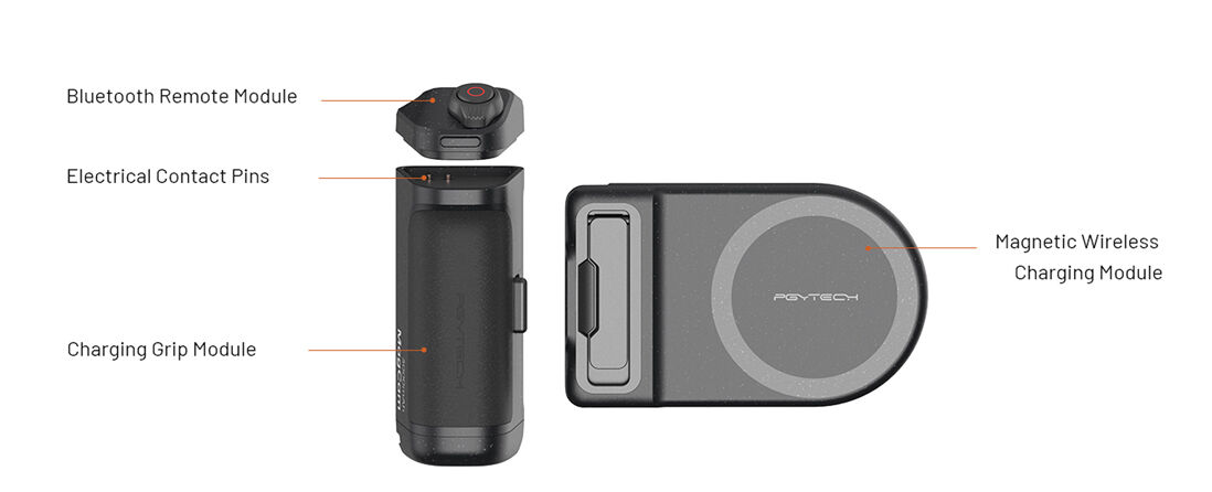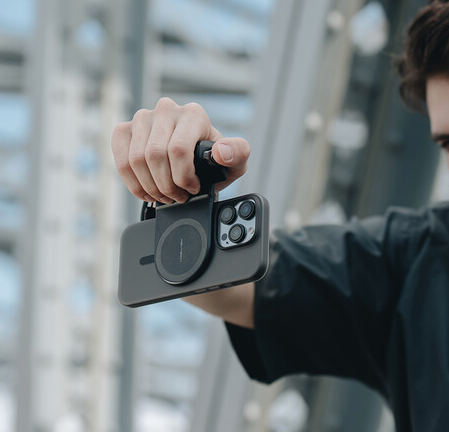 Su diseño modular permite convertir el soporte en un trípode para retransmisiones en directo, creación de contenido o uso manos libres. El módulo multifuncional de control del obturador funciona como un mando a distancia inalámbrico Bluetooth con un alcance de 10 m, lo que permite iniciar/detener la grabación de vídeo, hacer fotos, hacer zoom y ajustar la configuración sin tocar el teléfono.
